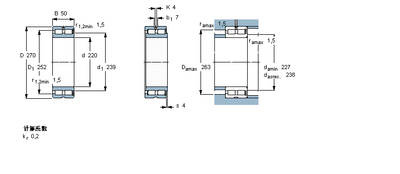 | 圓柱滾子軸承, 雙列滿裝滾子, 無密封件, 單方向軸向負(fù)荷的擋邊 | ||||||||||