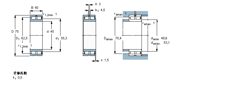 | 圓柱滾子軸承, 雙列滿裝滾子, 無密封件, 單方向軸向負(fù)荷的擋邊 | ||||||||||